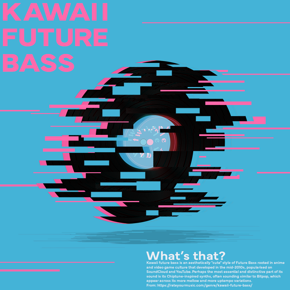 This poster visualizes the vibe of Kawaii Future Bass, one of my favorite music genres. To represent its playful electronic sounds, I incorporated pink tones and glitch effects into the design.