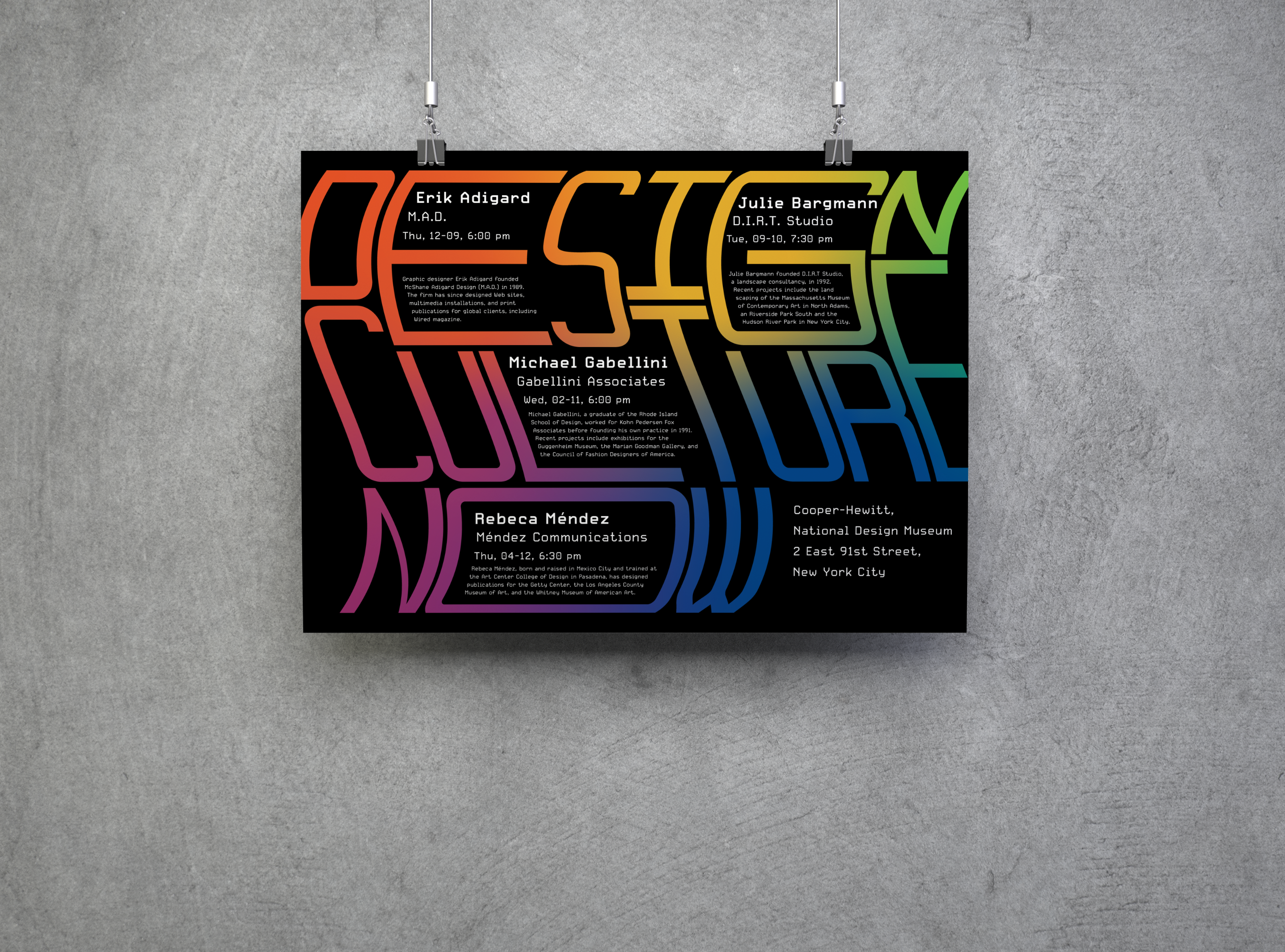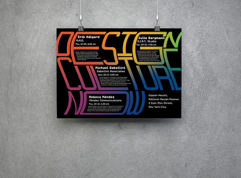This was a Typography class assignment to create a promotional poster for a design event. A vibrant color palette was used to represent the diversity of design, and a dynamic composition was chosen to catch the attention of passersby.