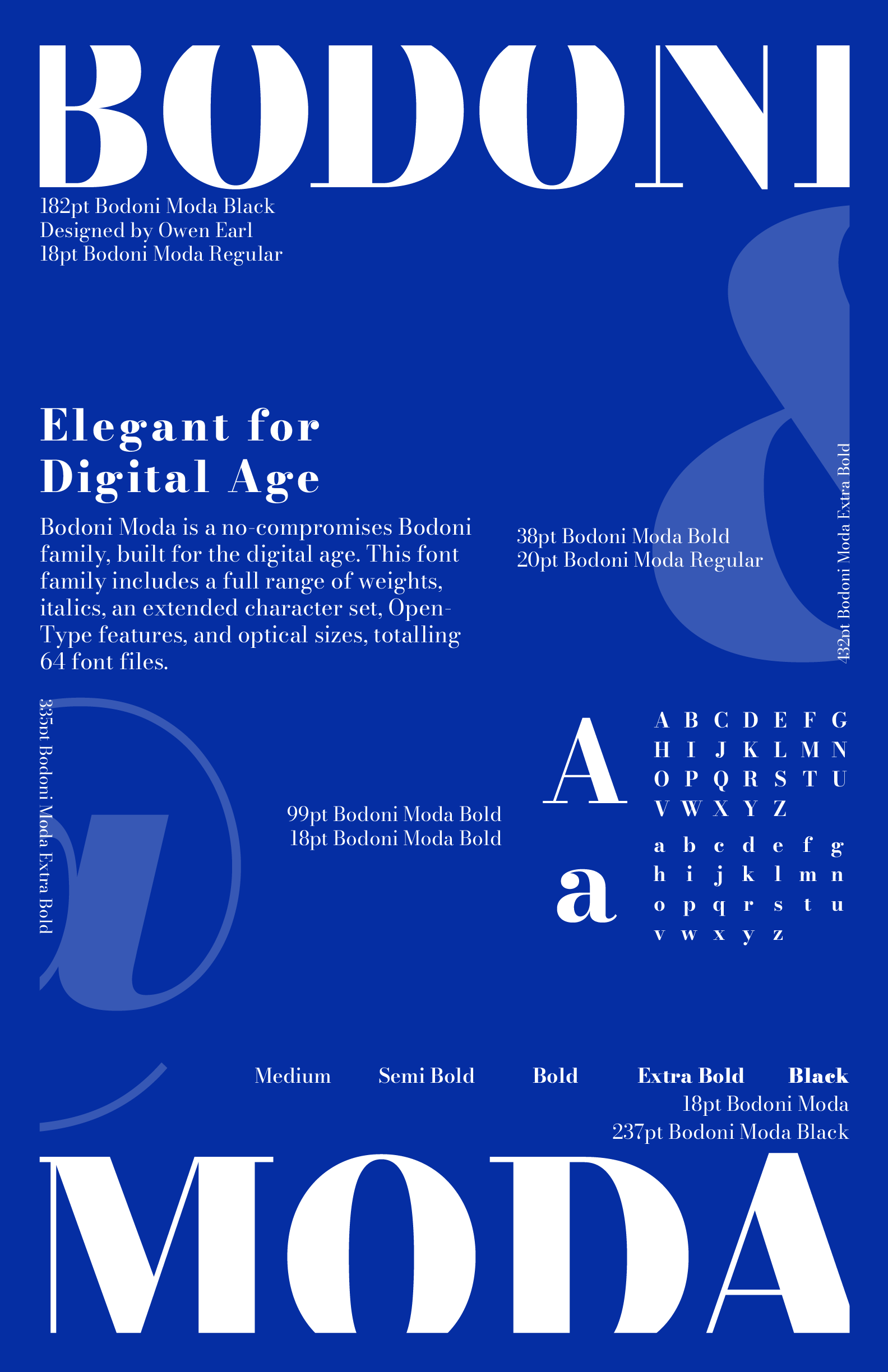 This is a Type Specimen created for a Typography class assignment. The featured typeface, Bodoni Moda, is a modern adaptation tailored for the digital age. To convey an electronic aesthetic, I used a blue color palette as the base while showcasing Bodoni Moda's versatility by scattering text elements in various sizes throughout the design.