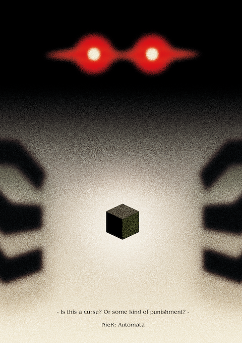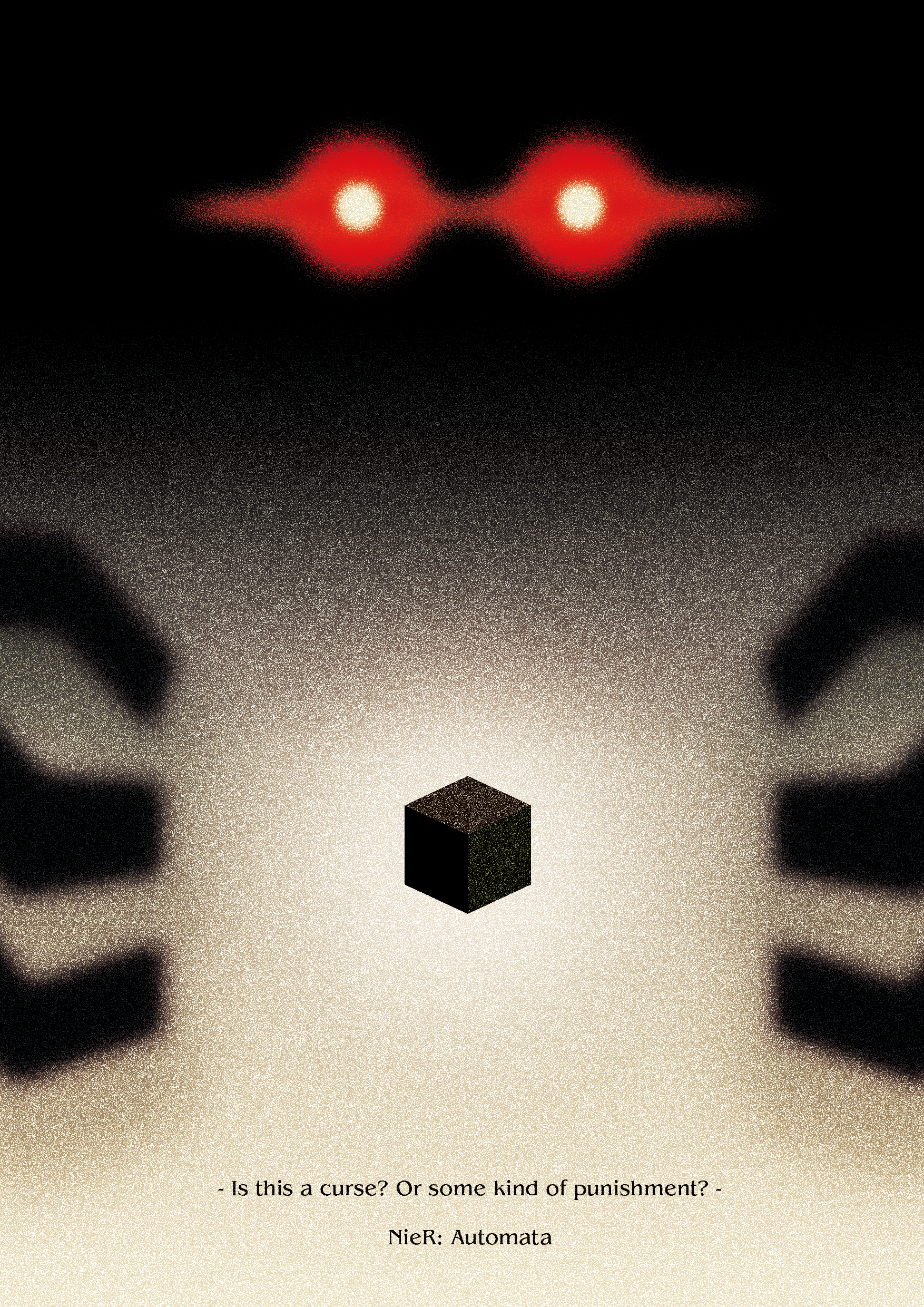This was an assignment for an art class, where we were tasked with creating a poster about something we love using minimalism. I chose the game Nier: Automata and focused on its core element, the Black Box. To capture the dark atmosphere of the game, I incorporated the glowing red eyes of its main robotic characters.